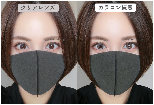 公式着画ではライト撮影、ミニラは自然光撮影写真です。公式着画ではグレージュ感がありますね♪瞳孔まわりのほんのりピンクが混ざったようなお色も見えます。ピンクは元の瞳の色によって発色の度合いが変わってきそうです。