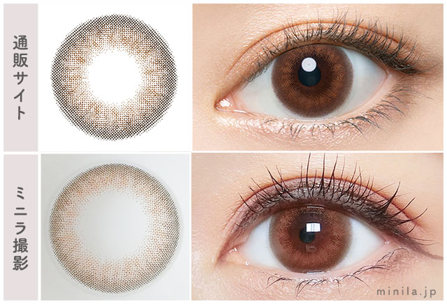 通販サイトのレンズイラストと比較するとほぼ同じイメージ。《ダークグレーフチ+ブラウン系》でフチは少し薄めです。中心のくり抜き感はありません。フチまでブラウンが重なっているためかダークブラウンっぽくも見えます。