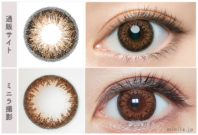通販サイトの着画と比較するとこんな感じ。光源が違うので見え方の誤差はありそうです。黒目さんだとフチはそのまま黒っぽく、メインカラーは黄みよりのブラウンに発色しています。黒目さんでも茶目さんでも可愛いに違いはありません笑