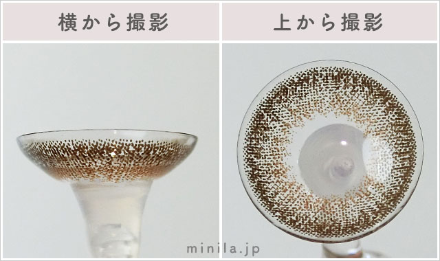 フチはドットでランダムな着色。フチ外側にはぼかしがはいっています。メインカラーの部分はドットの隙間が見えるので白目の透け感がどうなるか気になるところ。レンズは普通くらいでやわらかく、指の上で簡単にお椀型を整えることができました。