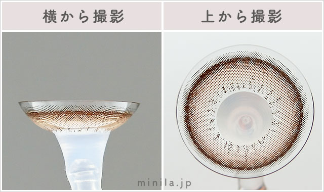 フチ部分のダークブラウンはぐるっと同じ濃度で着色しているわけではなく、よく見るとドットの濃淡で円を描いているのでくっきりし過ぎずやさしげな細フチになりそう。フチの外側にも薄くドットが配色されています。フチから中心に向けてオレンジブラウンがグラデーションに、瞳孔に向かってフチと同じ色のランダムな長さの放射線状アクセントがあります。レンズの厚みは薄めですがハリがあり、お椀型にすぐできました。