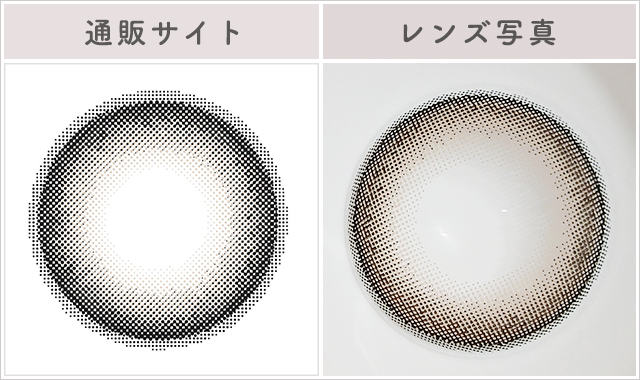 通販サイトのレンズイラストと比較するとこんな感じ。《黒の極細フチ+ベージュ系》で、フチはラインではなくドットで出来ています。そのためクリッと感はありつつ、くっきりしすぎないフチに。さらにたっぷりのぼかしが掛かっています。内側はベージュ系です。