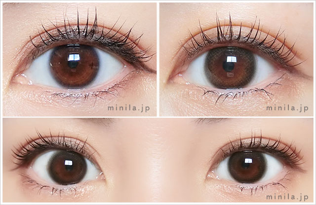 裸眼と比較するとフチ感が増して目元がクリッと強調されています。まるで生まれつきのような黒目。茶目さんだと少しトーンダウンし、黒目さんだとさらに馴染みやすいかと思います。普段DIA14.2mm派の方でも小さめがお好きな方に合いやいです。