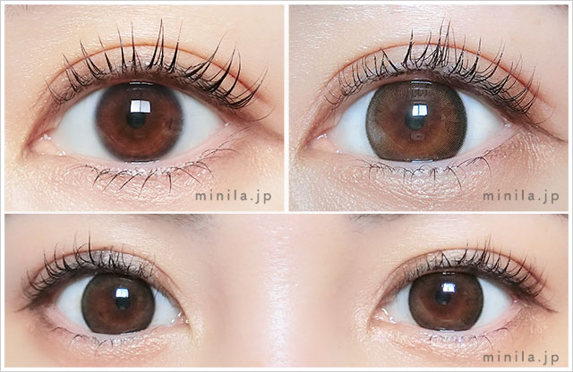 《茶フチ+チャコールベース+イエロー系ブラウンのハイライター》に発色!レンズで見ていた時と大体同じような色合いで、水光デザインと色味がめちゃくちゃ可愛い!イエローっぽいブラウンのハイライターのおかげで光が入ったように見えます♡体感12.9~13.1mm前後でシリーズ中一番小さいけど可愛い~