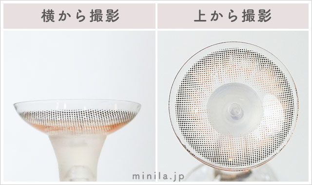 角度を変えるとオレンジっぽさが分かるかな?フチはドットでぼかしはほぼ無し。フチからオレンジへの細かいドットのグラデーションが綺麗です。ワンデーのハニースウィートに比べるとかなり薄くて優しい色合い。レンズの厚みは普通くらいで柔らかめ。指で簡単にお椀型を作ることができました。
