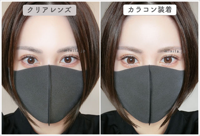 元が茶目のミニラでは《焦げ茶の細フチ+ダークブラウン+イエロー系の水光ハイライト》に発色しました。フチは黒に近いダークブラウンで細めなので上品に見えます。メインは裸眼のような暗めブラウン。イエロー系のハイライトが半周程入り、瞳がツヤっと煌めきます。