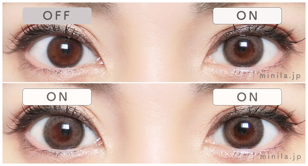 《くすみ感のあるダークブラウン+ブラウン》で暗めの印象です。茶目のミニラではトーンダウンする感じ。ワンデータイプよりベージュ感控えめで暗いような気がします。着色直径同じ/体感13.5mmでほぼ同じくらい。ナチュラルさはマンスリーの方があります。カラコンバレしたくない方はマンスリーのほうがおすすめ。