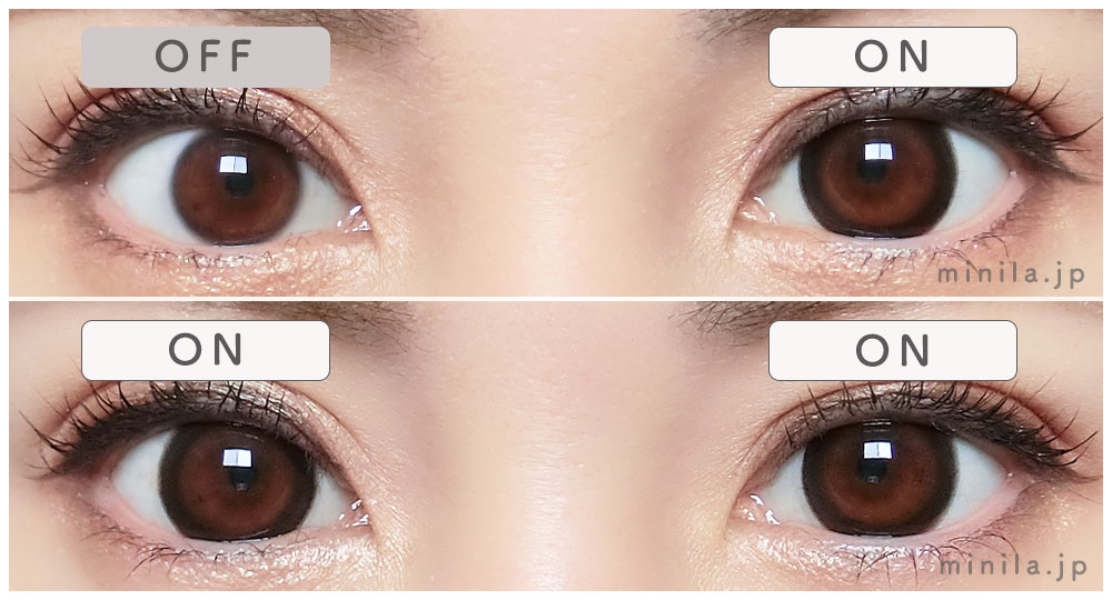 通販サイトの着用画像と比べてみるとこんな感じ。撮影環境が違うので誤差はありますが大体同じイメージです。黒目さんだとよりナチュラルで、黒目がそのまま大きくなったように見えるかも。茶目さんだと黒の太フチができたように。