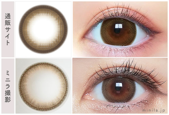 通販サイトの着画と比較してみました。ほぼ同じ見え方で、ミニラの方が少し白っぽく明るめな発色になっています。黒目と茶目での発色の違いになっている感じかな?本当にグラデーションが綺麗だから大きいサイズなのに自分の瞳のような気がしちゃいます。