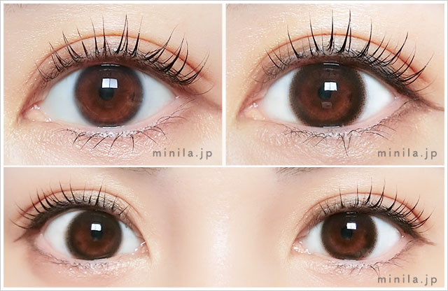ミニラの場合、裸眼よりも少し濃いめのダークブラウンになりました。かといって重たさはありません。裸眼をそのまま大きくくしたようなナチュラルさなので学校や職場で使いやすいです◎