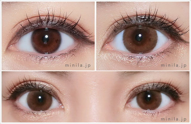 通販サイトの着画と比較してみました。ミニラの方が明るく発色していますね。黒目と茶目での違いになっている感じかな?サイトの着画ではちゃんとフチがあるように見えます。