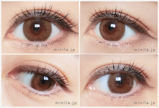 どの方向を向いても白目は透けにくいです。シリーズの中で1番明るめなベージュ系ブラウンで、色素薄い系~ナチュラルなハーフっぽさも。でも派手までいかないという絶妙な発色加減。カラコンらしい粒感がないので黒目にかなり自然に馴染んでいきます。