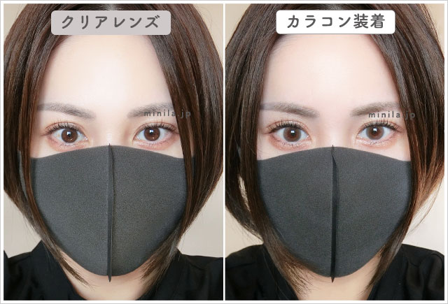 瞳孔周りのくり抜き感は近くで見るとあるようにも見えますが離れると目立ちません。レンズの端は若干透け感があり、小粒目のミニラではたまに白目が透ける時がありました。が、ぽわんとした着色なのと透ける部分がグレーなのでそこまで気になりません◎